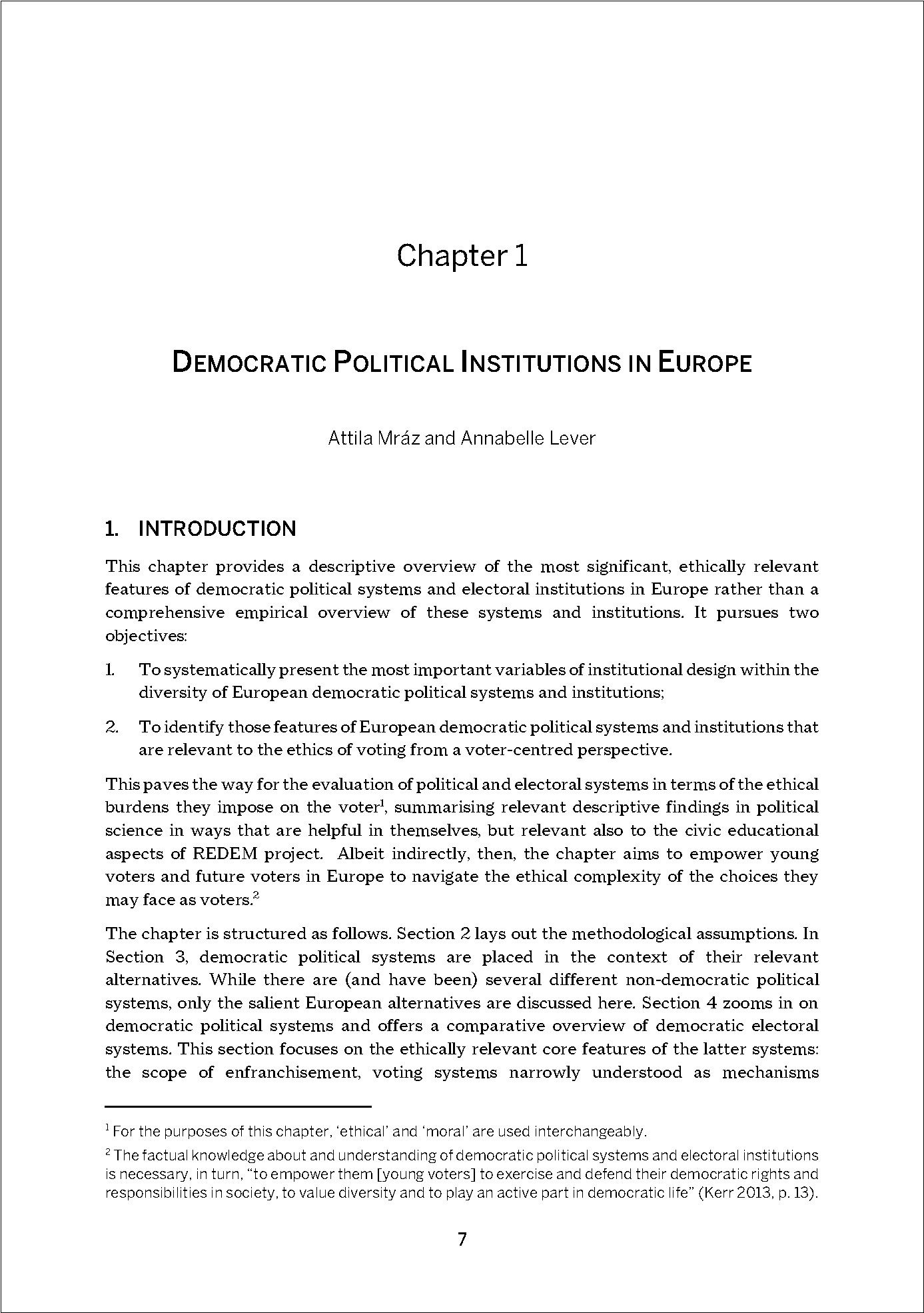 This chapter provides a descriptive overview of the most significant, ethically relevant features of democratic political systems and electoral institutions in Europe rather than a comprehensive empirical overview of these systems and institutions. To this purpose, the chapter pursues two objectives: