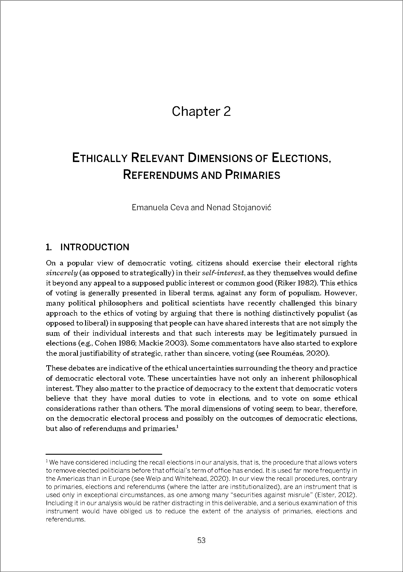 In this chapter we aim to collect information and identify the ethically relevant dimensions of different types of elections, including a discussion of referendums and primaries. After briefly presenting our approach, we identify three sets of sources of ethical uncertainty that voters face and then apply them to real-world examples that illustrate how these uncertainties intersect various institutional models of democracy and forms of democratic election. In our conclusion we sum up the discussion and ask a crucial question for a normative ethics of democratic voting that can yield practical guidance for citizens’ action, that is, “what level of knowledge of and commitment to daily politics may be expected of citizens as electoral voters?” To address this question, we conclude by pointing out the importance of heuristic shortcuts, as well as the recent emergence and rapid expansion of Voting Advice Applications (VAAs).