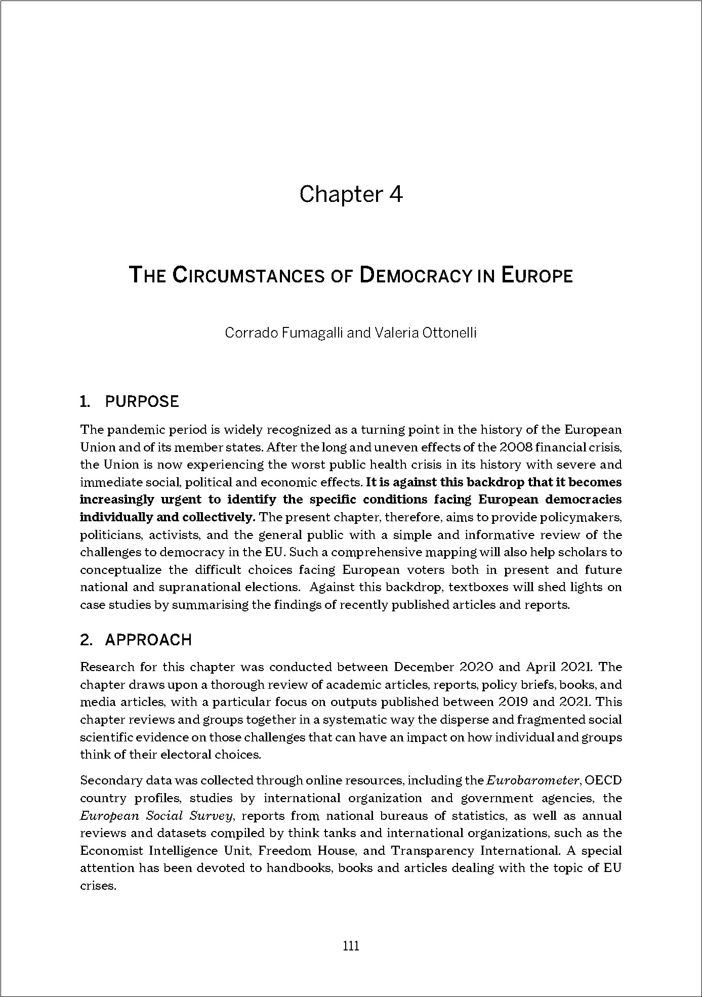 This chapter, which draws upon a thorough review of academic articles, reports, policy briefs, books, and media articles, secondary data, annual reviews and datasets compiled by think tanks and international organizations (such as the Economist Intelligence Unit, Freedom House, and Transparency International), the Eurobarometer, OECD country profiles, studies by international organization and government agencies, and the European Social Survey, with a particular focus on outputs published between 2019 and 2021, aims to provide policymakers, politicians, activists, and the general public with an accessible guide to the specific conditions facing European democracies individually and collectively. Against this backdrop, the chapter identifies nine main challenges to democracy in Europe: the democratic deficit in the EU, economic insecurity, the increasing polarization of European public spheres, the rural/urban divide, democratic backsliding in the EU, the pervasiveness of money in democratic campaigning, emergency politics and the COVID-19 pandemic, electoral security and the COVID-19 pandemic, and aging and the generational divide.